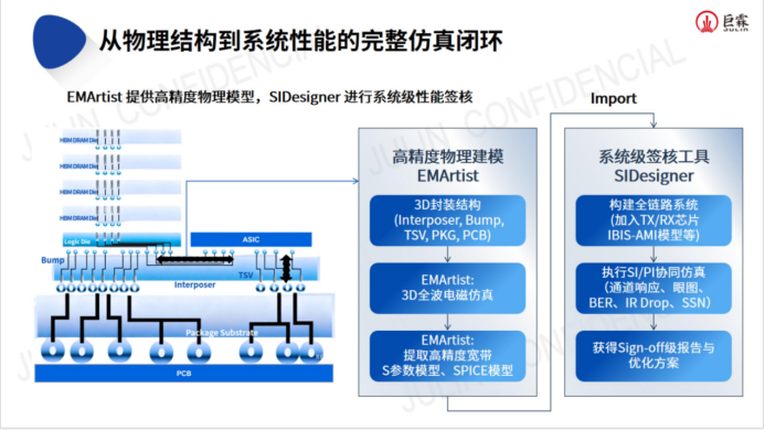 以巨霖科技的SIDesigner平台为例,通过与EMArtist协同构建完整仿真链路:EMArtist专注于3D封装结构(Interposer、Bump、TSV、PKG、PCB 等)的高精度电磁建模,提取高精度宽带S参数模型与SPICE模型;SIDesigner承担最终的系统级签核,通过集成TX/RX芯片模型与无源链路,执行SI/PI协同仿真,以全面评估通道、眼图及电源噪声(IR Drop, SSN),实现从物理原型到系统性能签核的精准验证闭环。