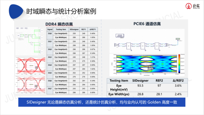 在实际场景验证中,SIDesigner在DDR4瞬态仿真、PCIe6通道仿真等高速接口场景下,眼图关键参数(眼高、眼宽)与国际标杆工具的差异普遍小于 2%,性能表现已达到业界 Golden 级精度标准。该平台全面覆盖 DDR/HBM 等并行接口、PCIe/MIPI 等 SerDes 接口的仿真需求,提供 True-SPICE 时域仿真和Channel Simulation两套解决方案,其搭载的TJSPICE 仿真器在收敛性、稳定性上与业界Golden级仿真器完全对标,部分场景精度表现更优。